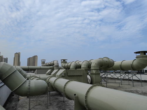 科學實驗室建設中的安防系統廢水 → 特異性炭進行全自動過濾器中 → 引通風機 → 排放口